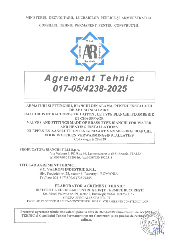 Agrement tehnic pentru armături și fitinguri din alamă – 017-05/4238-2025