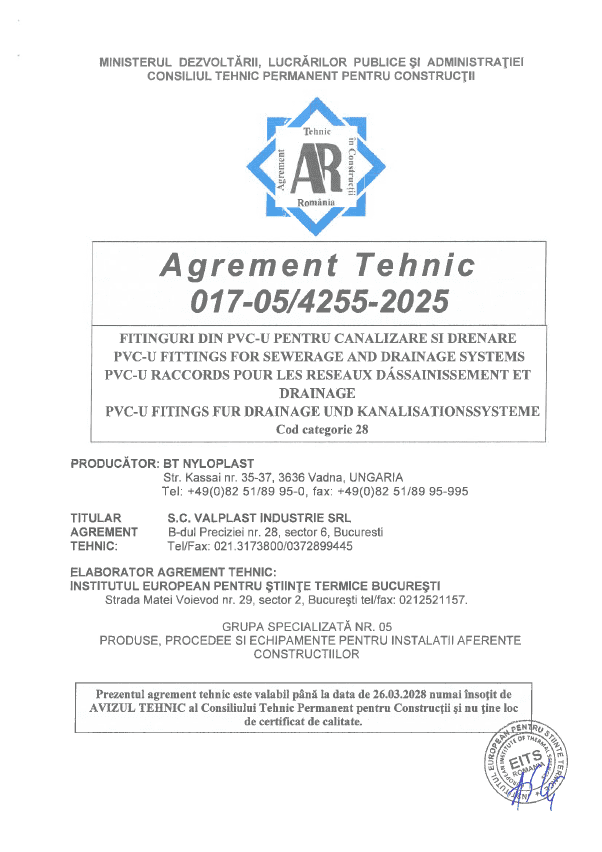 Agrement tehnic pentru fitinguri din PVC-U pentru canalizare și drenaj – 017-05/4255-2025