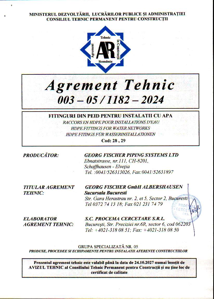 Agrement tehnic pentru fitinguri GF din PEID pentru apa – 003-05/1182-2024