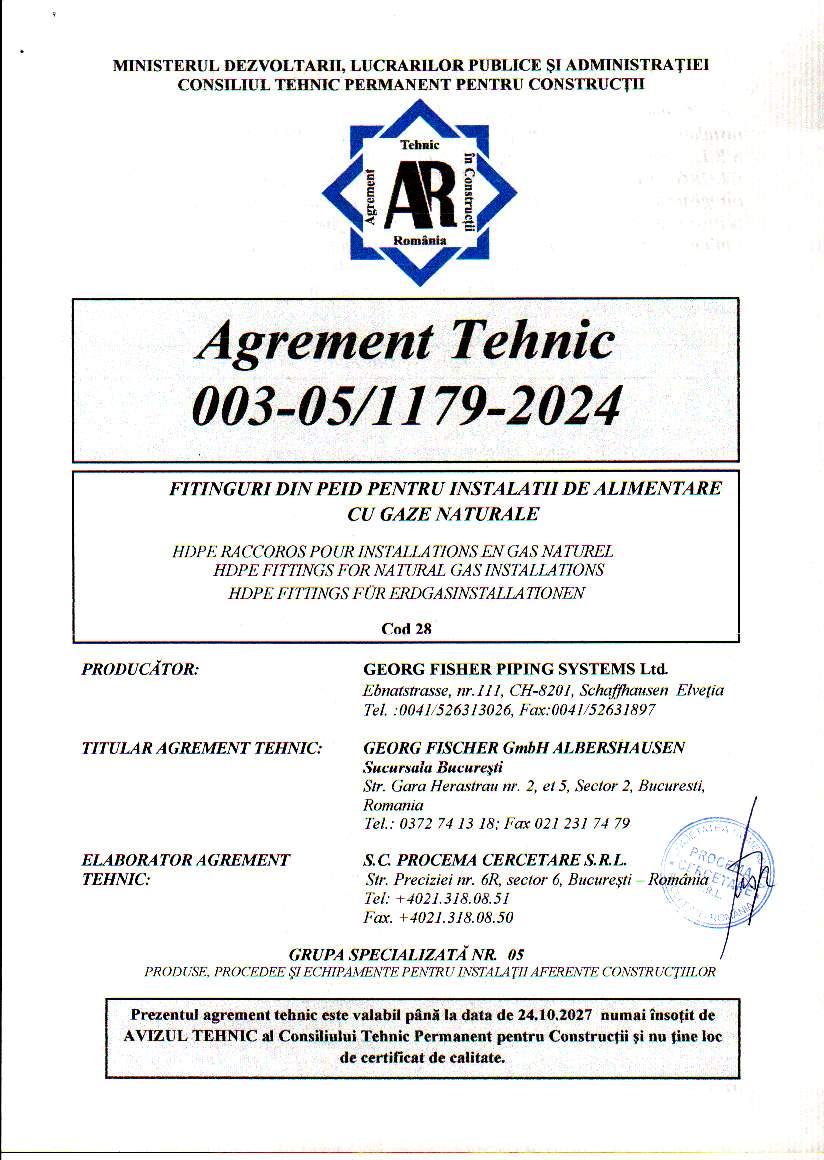 Agrement tehnic pentru fitinguri GF din PEID pentru gaze – 003-05/1179-2024