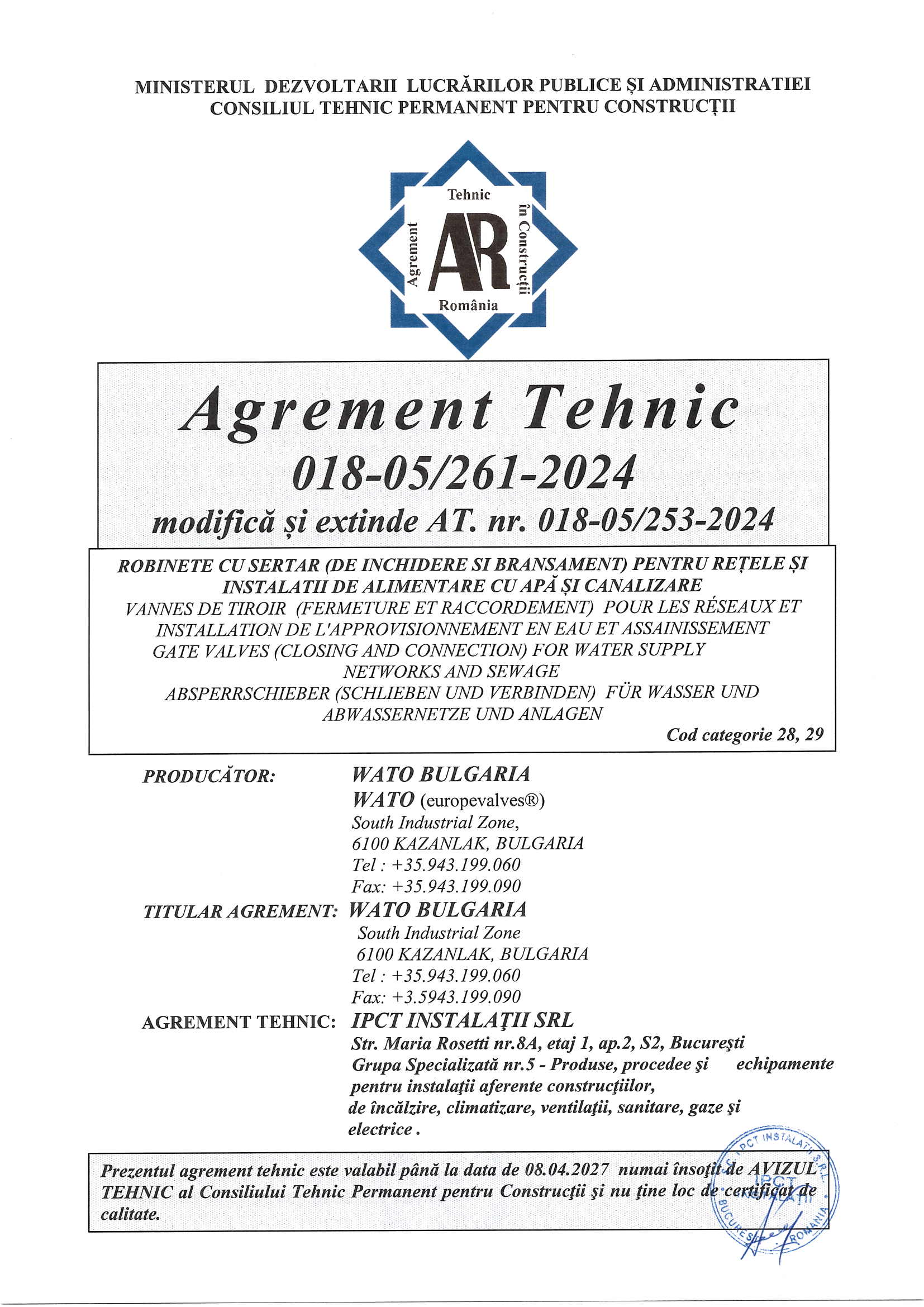 Agrement tehnic pentru robinete cu sertar – 018-05-261-2024