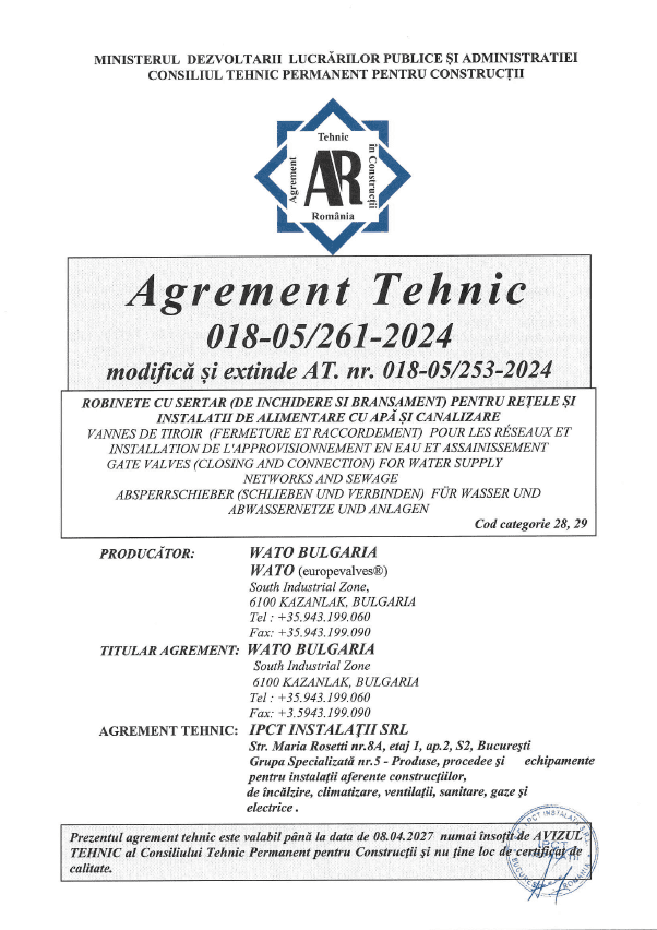 Agrement tehnic pentru robinete cu sertar din fontă – 018-05/261-2024